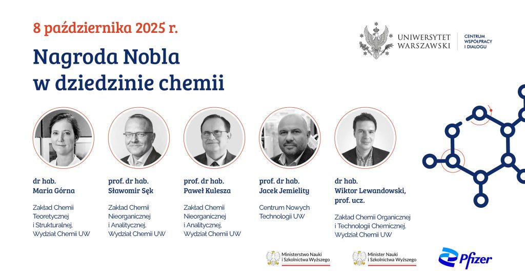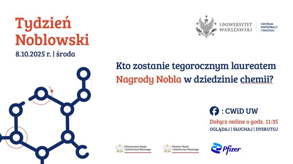 O godz. 11:35 rozpocznie się transmisja Centrum Współpracy i Dialogu Uniwersytetu Warszawskiego, podczas której eksperci z Uniwersytetu Warszawskiego przybliżą nam znaczenie chemicznego osiągnięcia, które zostanie wyróżnione w tym roku.