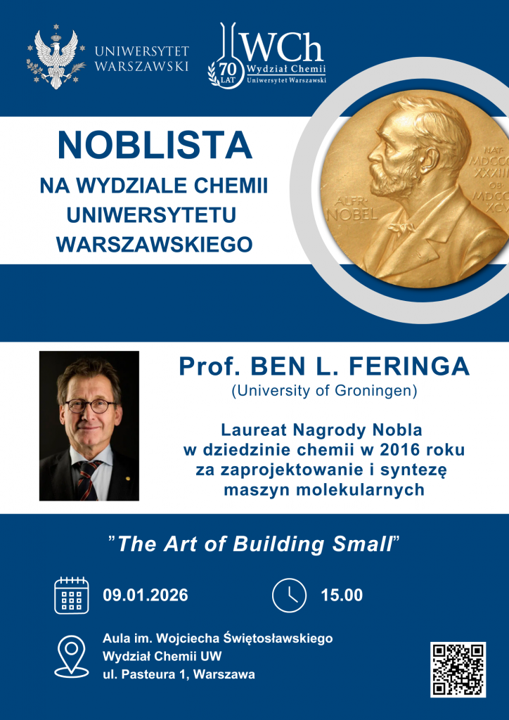 Strona główna > Noblista na Wydziale Chemii UW – Prof. Ben L. Feringa 09.01.2026 Noblista na Wydziale Chemii UW – Prof. Ben L. Feringa 09.01.2026 05 12 2025 « Seminarium Wydziałowe 10.12.2025Publikacja w ACS Central Science (2025) »