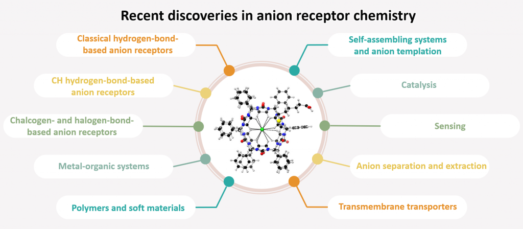 Anions play a crucial role in biological systems and many industrial processes. Therefore, scientists in the field of supramolecular anion chemistry are actively developing selective anion receptors, chemosensors, and transporters, which may find applications, e.g. in the treatment of cancer and cystic fibrosis. Research on anion recognition-based catalysts is also progressing – these are often metal-free molecules that employ hydrogen bond donors to stabilize reaction intermediates.